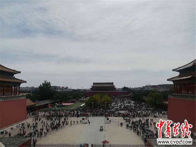 故宫,这座明清两代的皇家宫殿,承载着国庆期间来自五湖四海无数游人的梦想。在故宫北出口神武门外,来自河南南阳的李青,童年时随父母来过一回,几十年过去了,终于再次踏入故宫。虽然拥挤,可一看到红墙琉璃瓦的古代宫殿,她还是情不自禁地摸出手机拍照。故宫的服务令她印象深刻,有不懂的地方向工作人员询问,她总会得到及时的回应。而在另一头的故宫入口午门检票处前,不少游客因未买到票,只能在门外驻足拍照,望“城”兴叹。