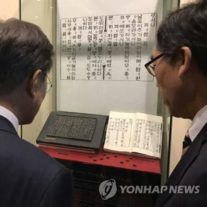 资料图片:文在寅(左)在出席联大期间参观陈列于联合国总部的《月印千江之曲》。(图片来源:韩联社)