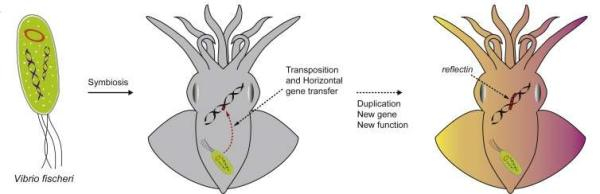 谢灿等人根据上述信息,提出了Reflectin基因起源于共生细菌的水平基因转移假说:他们认为,费氏弧菌在与鱿鱼等头足类动物共生的过程,其TnlD等基因漂移到了这些海洋生物体内。在漫长的生物演化过程中,TnlD基因中的某些片段,比如前述24碱基对基因片段,由于某些特殊的性质,深受头足类动物的青睐,因而在自然选择中被保留下来。这些幸存下来的基因片段,经过多次扩增、重复,逐渐演变成了今天头足类动物特有的Reflectin基因。