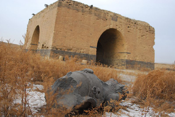 如今的得胜堡,是一座黄土城墙包围的小小村庄,小而残破。一个方方正正的城堡,外边的巨大墙体应该就是瓮城,城门早已不见,仅剩下和内城相连的两堵厚实的墙体。墙体城砖尽皆剥落,阳光下黄土显得更加沧桑,但整个建筑却依然伟岸、雄浑,周边开阔的雪原更加烘托除了它非凡的气势。