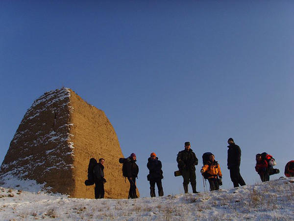 离开了得胜堡,我们在积雪的田野里吃了午饭,然后继续向西北方向绵延的丘陵前进,走过冰封的拒马河,一座烽火台正立在山坡之上,离烽火台不远处是高压电线塔。破败的黄土烽火台,远不如身后的钢铁巨塔高大,然而这种梯形立方体的古代建筑威严而敦厚,拒敌千里的气势却远不是那钢铁怪物所能匹敌。它见证过千军万马厮杀的喧嚣、雪流成河的残酷、王朝更替的屈辱,它穿过时光之河、迎接过风暴沙尘的洗礼,依然在原野上傲然挺立。
