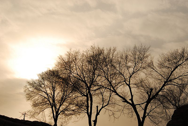河东窑距离长城很近,长城内的山西一侧几乎全是农田,一个个村落星星点点坐落其间。我们的计划就是在村外不远处的空地上安营扎寨。此时夕阳低斜,望向河东窑,房屋和树木的剪影在黄昏暮色中别样迷人。