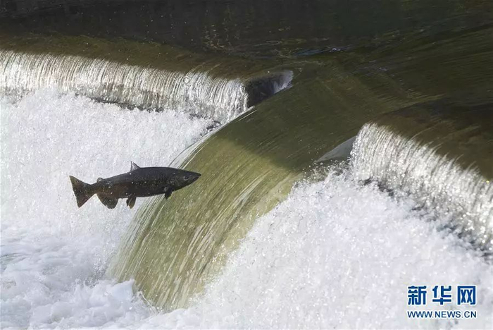 10月8日,在加拿大多伦多,一条三文鱼跃出亨伯河水面,试图跳过水坝。加拿大安大略省每年9月进入三文鱼洄游季。这时,数以万计的成年三文鱼不远千里从大海中游回出生地产卵、繁殖并终老于此。