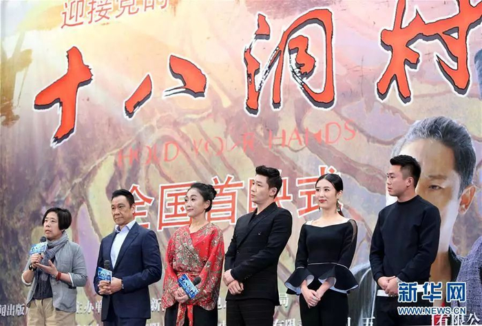 10月9日,导演苗月(左一)携演员王学圻(左二)、陈瑾(左三)等主创人员出席首映式。当日,反映精准扶贫题材的电影《十八洞村》在北京全国政协礼堂举行首映式。这部由潇湘、峨眉、华夏三大电影公司联合出品的影片取材于全国精准脱贫典型湘西十八洞村的事迹,反映了以土地为依托的农民追逐美好生活的故事。该片由苗月执导,王学圻、陈瑾等主演,将于10月13日在全国上映。