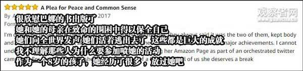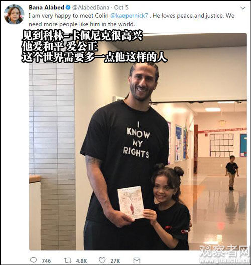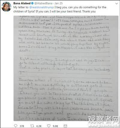 1月25日,巴娜在推特po出她写给特朗普的信,要求特朗普“为叙利亚儿童做点什么”。而在特朗普颁布旅行禁令后,巴娜连发数条推特表达不满。