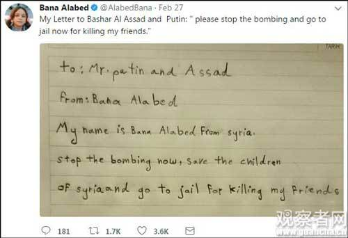 2月27日,巴娜写道:“给普京和阿萨德的信:我叫巴娜,来自叙利亚。你们现在停止轰炸,救救叙利亚的孩子。你们杀了我的朋友们,你们要去坐牢。”