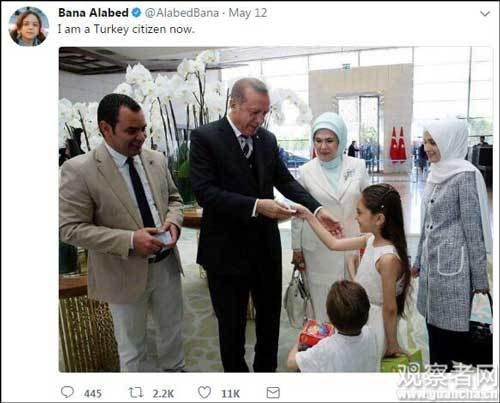 5月12日,获得了土耳其国籍后,巴娜兴奋地po出自己和埃尔多安的合影,写道:“我是一个土耳其公民啦。”