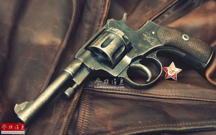 图为苏联纳甘M1895转轮手枪,实际是由比利时设计师纳甘于1895年发明,直到1899年,沙俄才引进生产线,在图拉兵工厂制造。该枪使用7.62毫米弹药,容弹量7发,有效射程46米。
