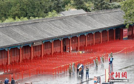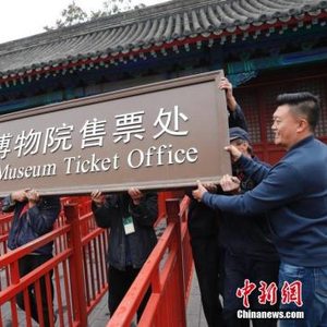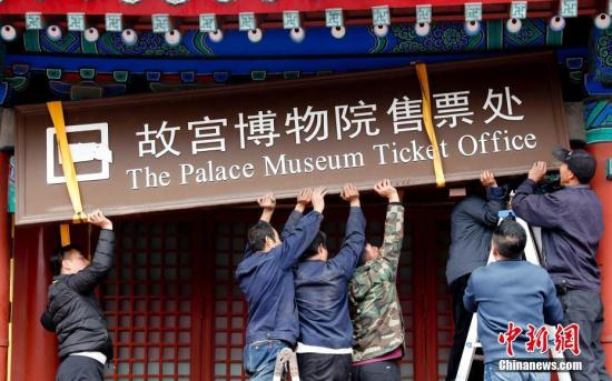 10月10日,北京故宫博物院售票处的牌子被工作人员摘下。中新社记者 杜洋 摄