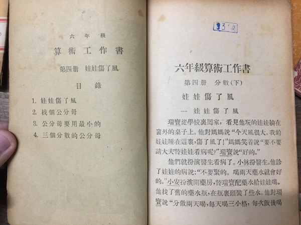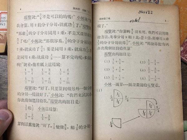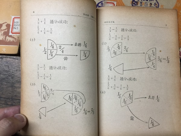 这时的数学题已经教到二分之一减四分之一的异分母加减。查阅以后发现,这部分内容,在今天使用较为广泛的人教版数学教材中,属于五年级下学期教授的内容。
