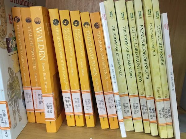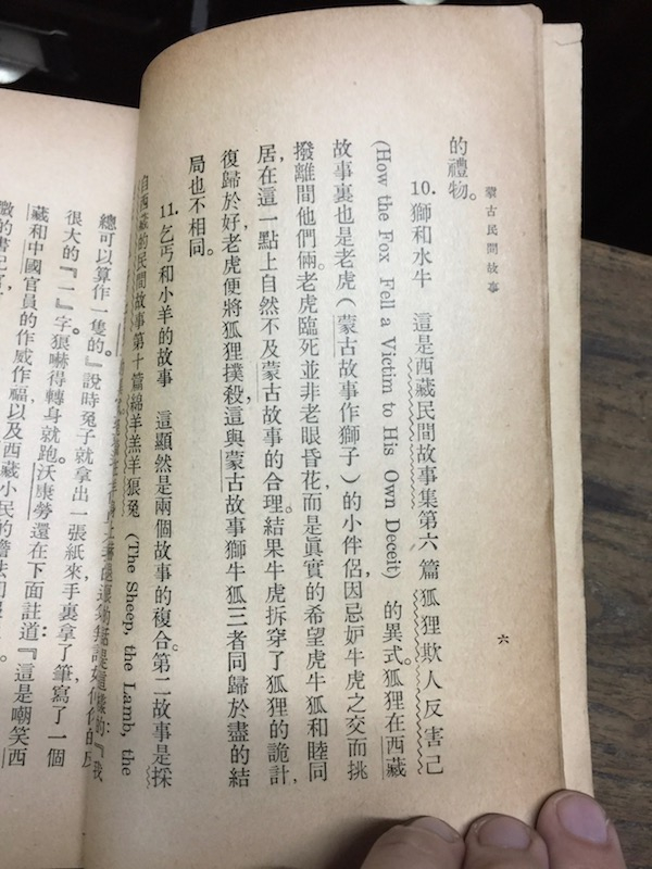 翻阅《小学生文库》时,我还发现了一些有趣的现象。首先,竖版阅读对于文中插入英语而言,会带来不小的阅读麻烦。为了读清一串英语语义需要将书打横来看,例如《蒙古民间故事》中“狐狸欺人反害己(How the Fox Fell a Victim to His Own Deceit)”。
