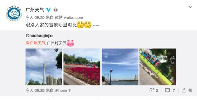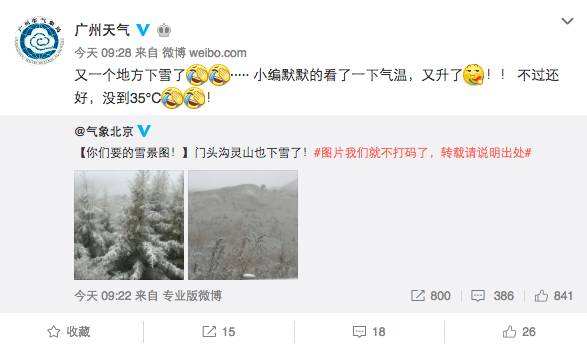 得知北京部分地区下雪的消息后,广州市气象局发微博称: