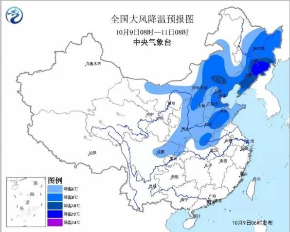 另据中新网消息,受冷空气影响,西北、华北到东北一带地区出现了大范围降温,尤其在青海东部、甘肃中南部、宁夏到内蒙古西部一带,均出现了10℃以上的气温大跳水,降温剧烈。