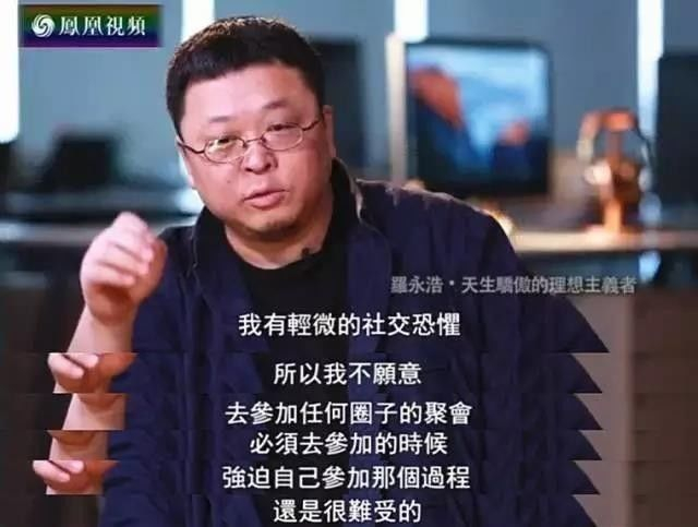 看过某一期的《鲁豫有约》,锤子科技的CEO罗永浩在接受采访时承认,他有轻微的社交恐惧,所以他不愿意去参加任何圈子的聚会,因为强迫自己参加的那个过程会很难受。