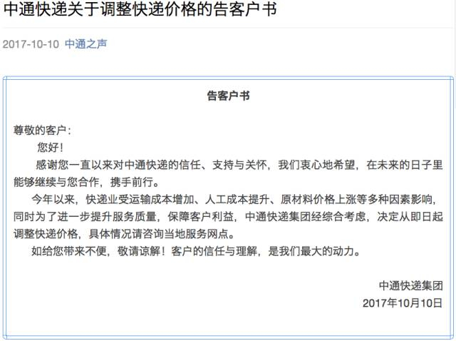 10月10日晚间,中通快递官方微信“中通之声”发布了一份《告客户书》表示: