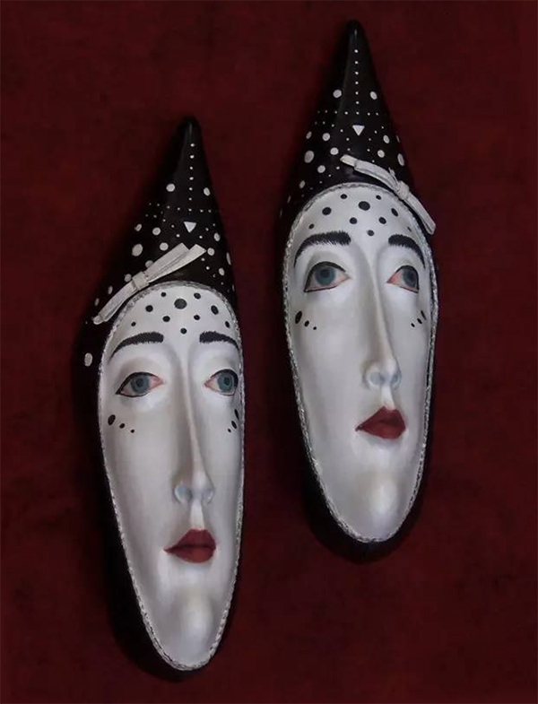 尽管展览上的这些鞋子背后的含义令人深思,不过,一些鞋子的设计的确让人大开眼界。千万不要以为这些奇怪的鞋子只存在于博物馆,现实生活中还有不少根本穿不了的怪鞋子。比如美国雕塑艺术家Gwen Murphy将回收的各种旧鞋子,利用粘土和丙烯酸涂料加工后变成各种有表情的脸谱,让鞋子重获新生。她设计的这些怪异的鞋子,有着长长的脸,好奇的眼睛,撅起的大嘴巴,与鞋子组合成一张独特的面孔,相当令人惊讶。
