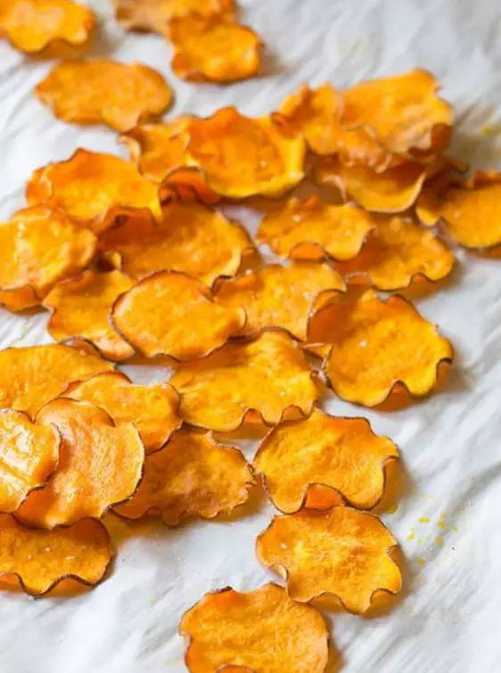 2. 将红薯片放在一个大碗中,淋上适量橄榄油,将薯片与橄榄油拌均匀。