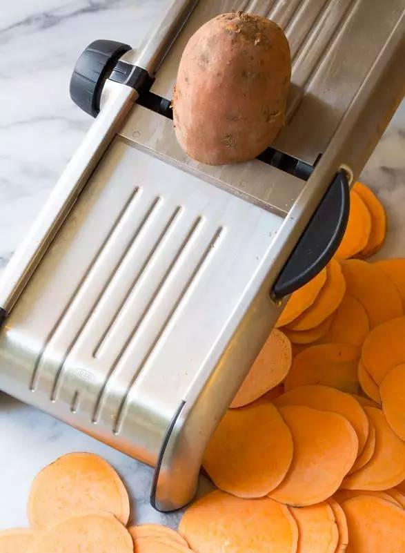 1. 烤箱预热到120℃,红薯洗净,切成薄片,如果不太会用菜刀可以用削皮器切。