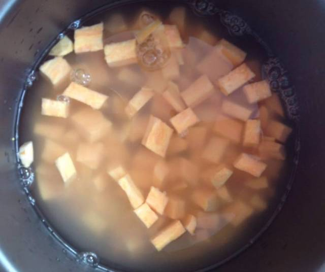 2. 小米淘洗干净,放入电饭煲内,放入红薯块,加入适量水,按煮粥功能即可。