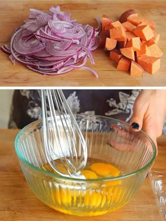 1. 将红薯和洋葱切好,鸡蛋打成蛋液放入盐、黑胡椒、黄油调味。