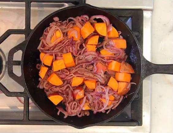 2. 把切好的洋葱和红薯放在平底锅中先炒熟。