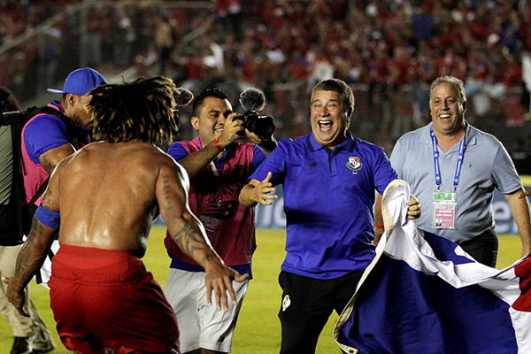 巴拿马队出线后,教练与球员庆祝。视觉中国 图