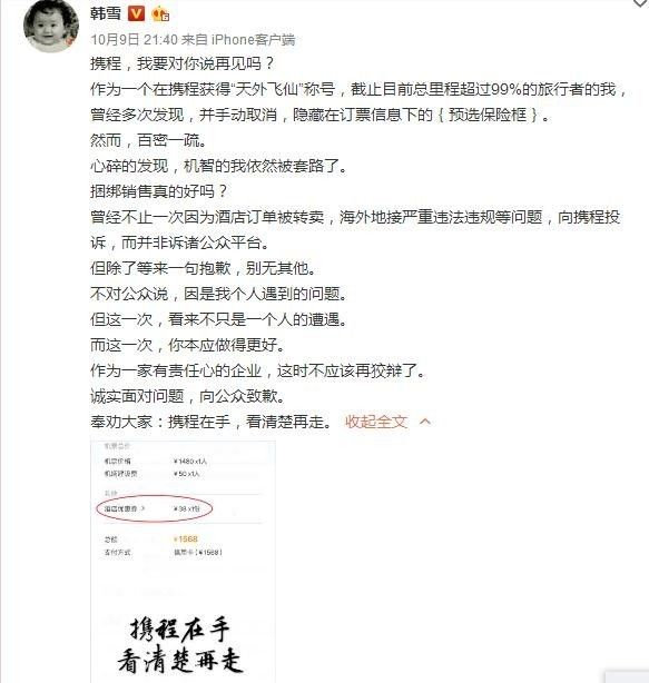 9日晚间,针对携程捆绑销售的问题,演员韩雪发表微博声讨,“携程,我要对你说再见吗?作为一个在携程获得‘天外飞仙’称号,截止目前总里程超过99%的旅行者的我,曾经多次发现,并手动取消,隐藏在订票信息下的{预选保险框}。然而,百密一疏。心碎的发现,机智的我依然被套路了。捆绑销售真的好吗?”