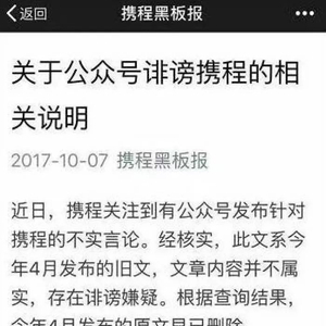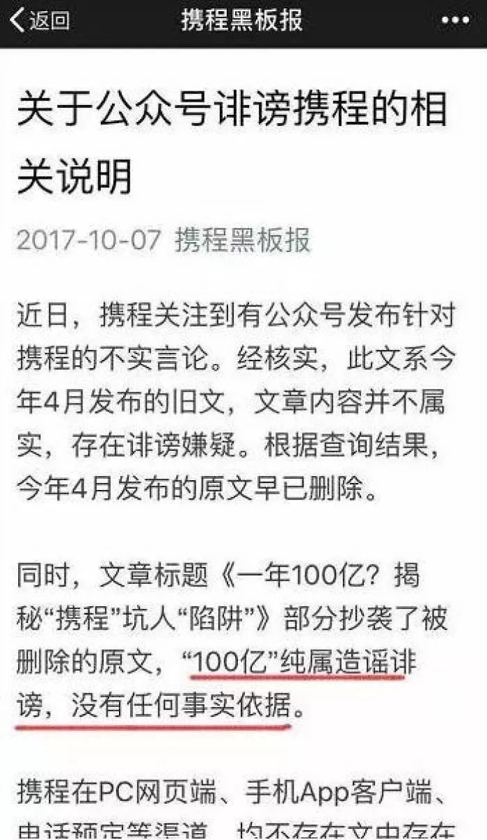 10月7日,携程官方公众号“携程黑板报”发文《关于公众号诽谤携程的相关说明》,对网传热文作出回应:“100亿”纯属造谣诽谤,文章内容并不属实,携程保留追究法律责任的权利。但是,目前此消息在其官微已找不到。