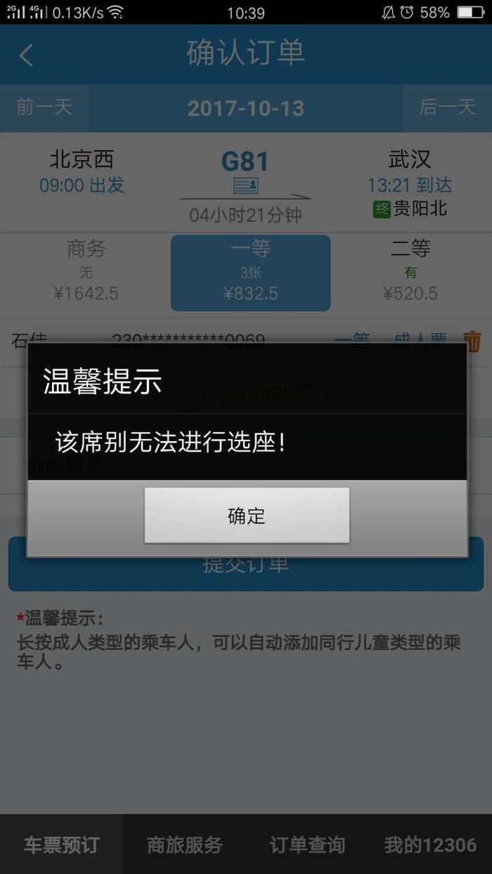当座位很少时,会显示出余票数量,比如这班北京到武汉的列车,一等座只有3张余票,虽然也有点击选座选项,但点击后会提示你无法选座,只能直接购票。