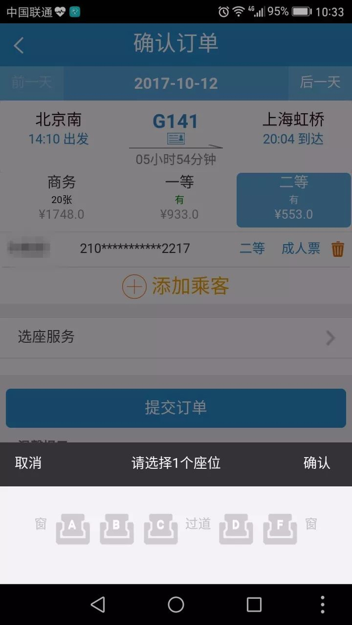 点击其中一个车次,在选择席别后,下方多了一个选座服务。点击选座服务后,可以选择座位,但不能选择排数。