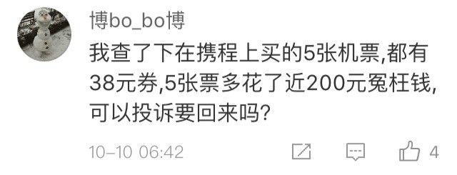 这张订单明细截图中,除了应有的机票价格与机场建设费之外,还额外出现了38元一份的“酒店优惠券”。她表示,“作为一个在携程获得‘天外飞仙’称号,截止目前总里程超过99%的旅行者的我,曾经多次发现,并手动取消,隐藏在订票信息下的{预选保险框}。然而,百密一疏。心碎地发现,机智的我依然被套路了。”