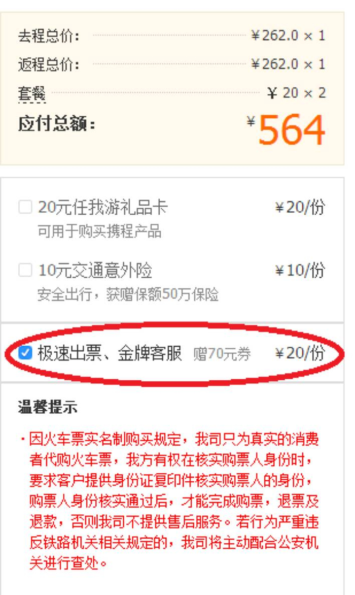 携程:在付款界面默认选中了20元一份的“极速出票、金牌客服”套餐