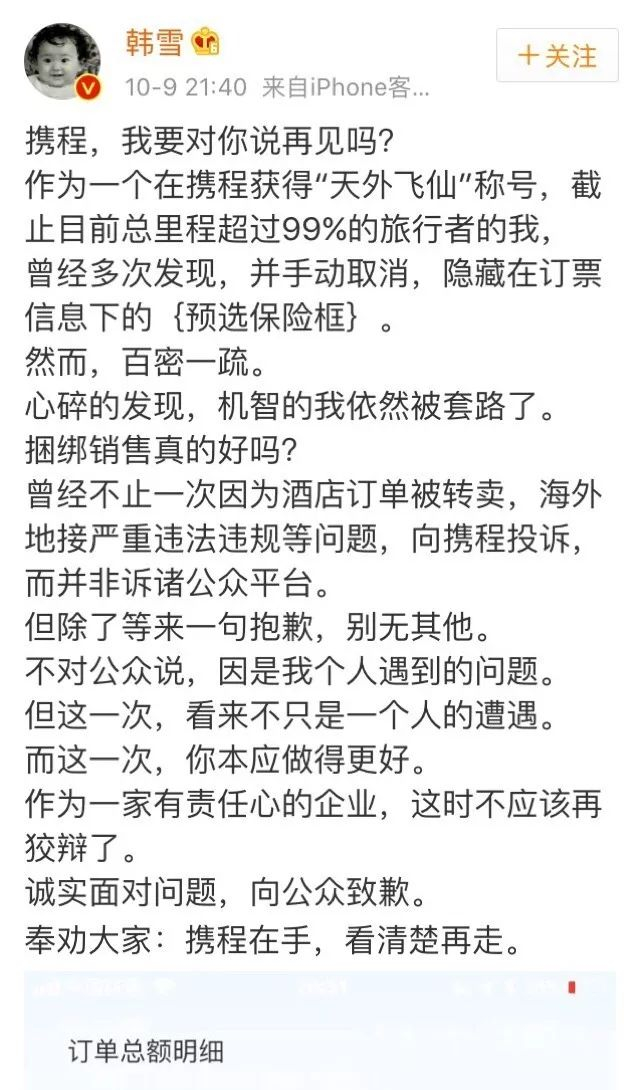 10月9日晚,演员韩雪在微博晒出一张携程订单,质疑其捆绑销售的问题,并调侃广告语称“携程在手,看清楚再走”,并称自己之前也曾多次在携程遭遇酒店订单被转卖、海外地接严重违法违规等问题,向携程投诉除了得到一句“抱歉”并无其他。