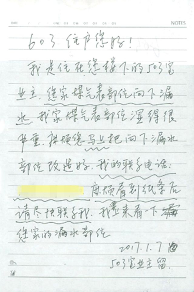 503的住户留了一张纸条给白阿姨,说自己厨房的天花板漏水严重,急需处理。白阿姨赶紧找人把厨房的地砖敲开,查找漏水点。