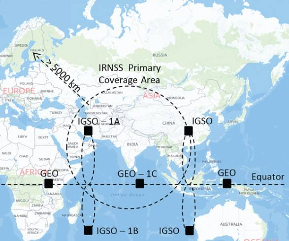 以前,印度有一个依赖于GPS的区域增强系统,上文提过,在印巴冲突期间,美国关掉了交战双方的GPS服务。印度后来自力更生,建成了一个独立的区域增强系统IRNSS。覆盖范围仅限印度这一片,而且,最近几颗卫星上的原子钟接连出现故障,如果不快速发射卫星进行补充,很可能会导致任务失效。