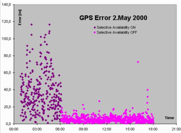 在美国GPS一家独大之时,美国军方在所有民用信号上放了干扰。后来俄罗斯格洛纳斯(GLONASS)系统出现,美国为了应对竞争才取消了这个干扰(2000年5月2日)。从图中可以看出,取消干扰后,民用信号的定位精度直接从百米级提高到了今天的米级。