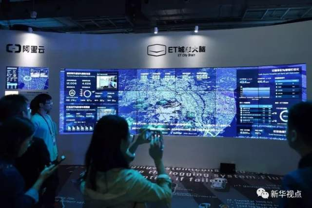 10月12日,观众在2017杭州·云栖大会的阿里云展厅观看城市大脑的展示。新华社记者 黄宗治 摄