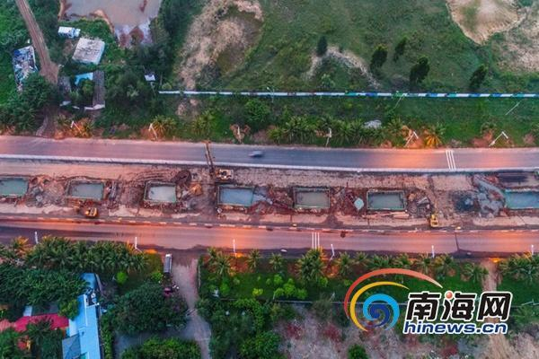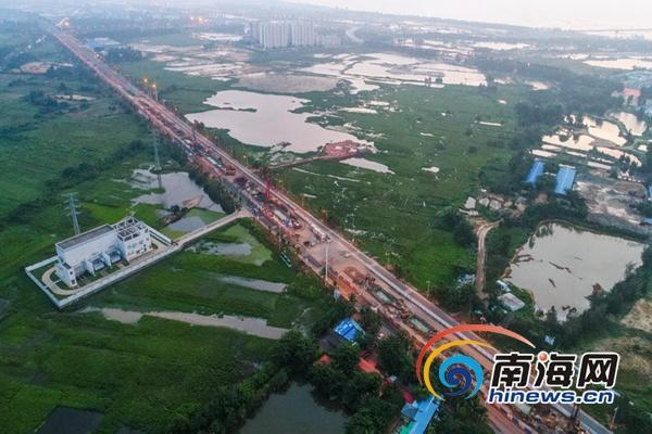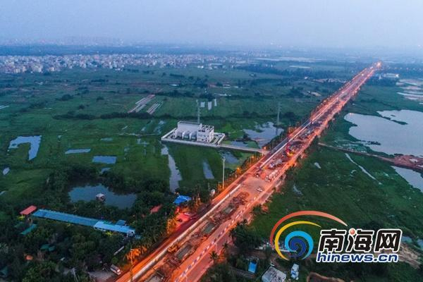 10月8日晚,高空航拍海口市粤海大道,海口第二条高架快速路在这里如火如荼加紧施工建设中。海报集团全媒体中心记者张茂摄