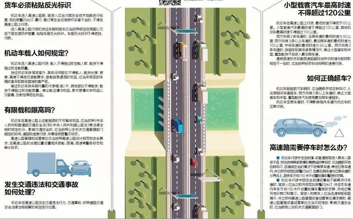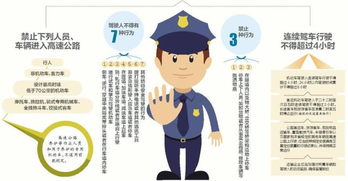 《办法》明确,影响交通施工必须提前公告、连续驾车行驶不得超过4小时、高速公路上不允许试车和学车、高速公路禁止抛洒物品、交警可在高速公路设流动检查站等内容。