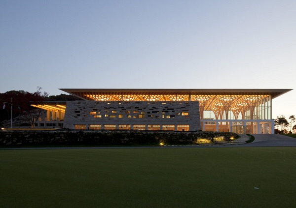 这是韩国一家高尔夫球中心。因为我不打高尔夫球,所以不清楚高尔夫中心里面应该是怎么样的。我记得很小的时候父亲带我去高尔夫练习场,那里的梯子是木制的,所以我设计这个高尔夫中心的时候,也把梯形结构用在里面。这个建筑的顶端用的是单层木质结构。这是一个非常简单的拱形建筑。