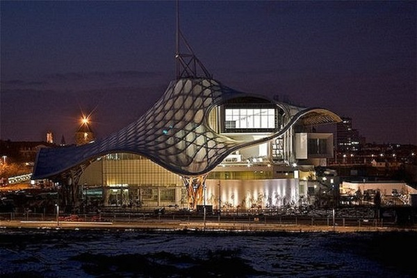 这是巴黎的塞纳音乐厅。圆形球状是音乐厅主体,可同时容纳1200人,巴黎市政府想将这个项目打造为西巴黎的地标性建筑。三角形帆板是一个太阳能板,可以根据太阳的位置而移动,让球形音乐厅内产生不同的阴影效果。船形结构上面是屋顶花园,里面是另外一个会议厅,可以容纳4000人。