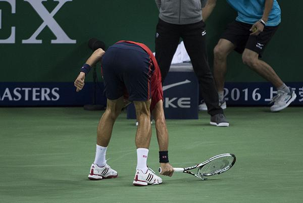 2016上海网球大师赛男单半决赛,德约科维奇气愤摔拍。东方IC 资料图