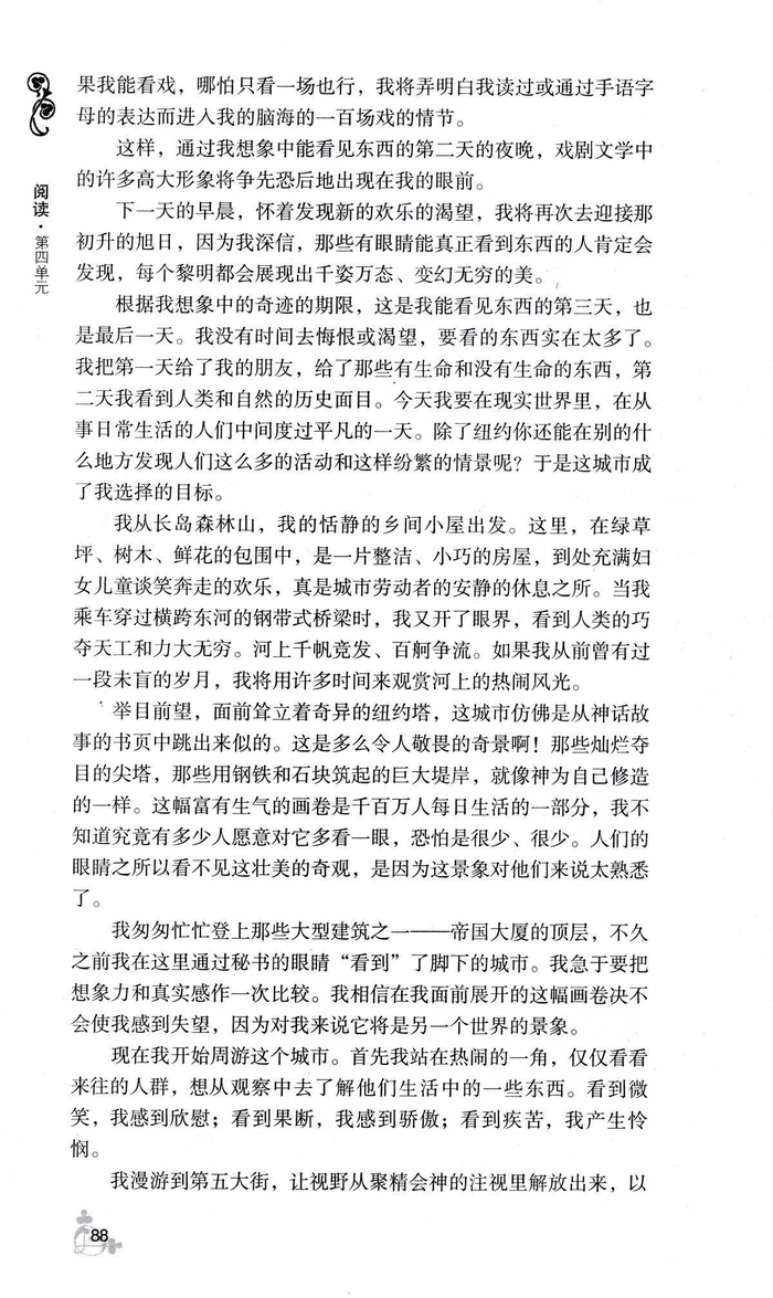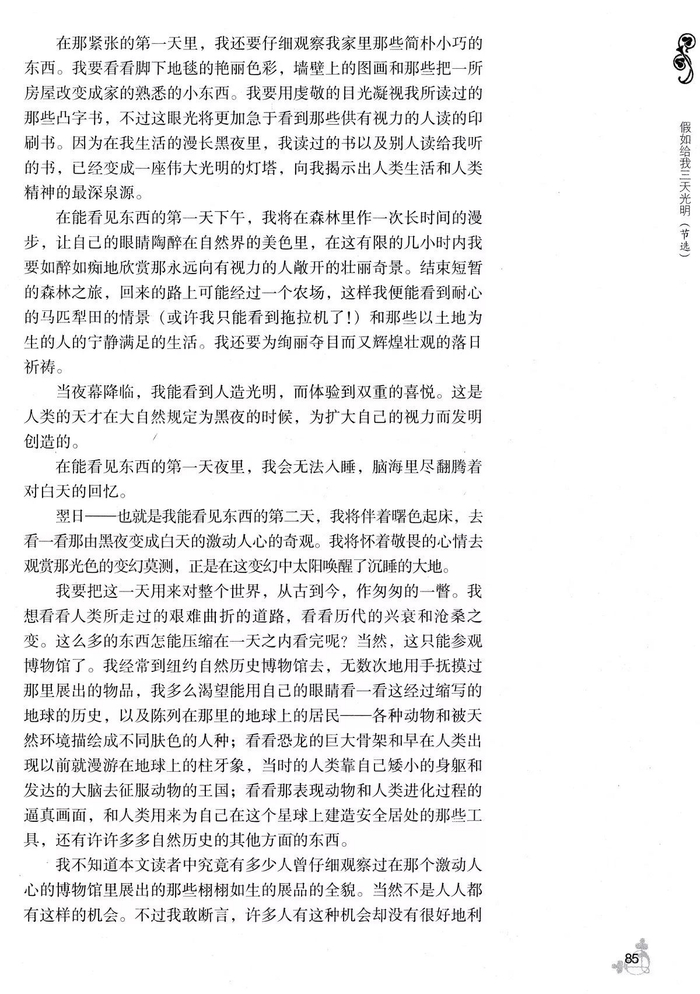 《假如给我三天光明》所以能深深地打动读者,还在于它的真挚而强烈的感情,在于它所给予读者的敞开心扉的亲切感。在这篇用第一人称写的、富于激情的作品里,作者倾诉了她对生活的礼赞,表达了她的生活态度。正由于文章是作者至性真情的流露,所以虽然整篇文章都是虚拟的,所记叙的事情多是非现实的,但使读者感受到了更高的真实----情感的真实。