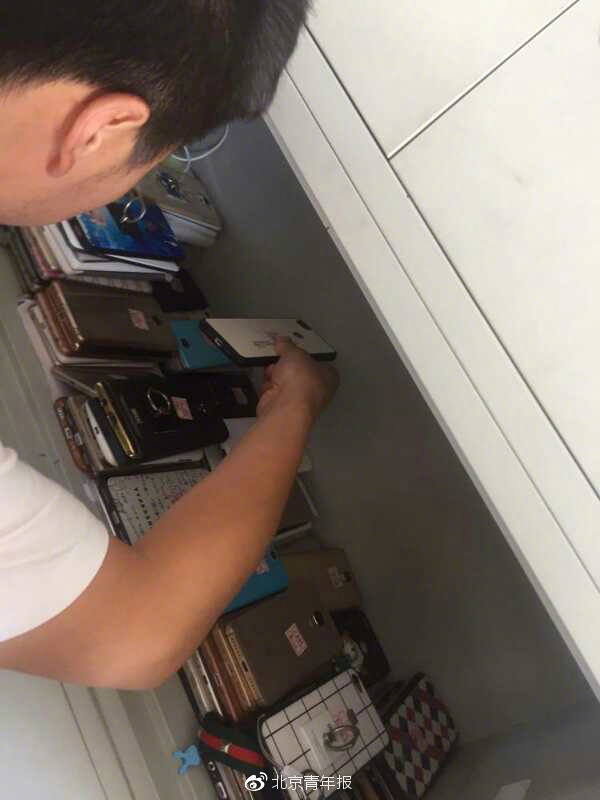 刘劲松介绍,该校设置有“教官”一职,专门负责纪律巡查。刘劲松被砸的手机就是被教官在未告知的情况下从抽屉里拿走的。他回忆,那是一款三星手机,购买时市场价5400元。当时教官给出两个选择,“手机拿来销毁,要不然你就回家”。 刘劲松提供给北青报记者一张半年前他所拍的照片,“这是两个年级收上来的手机,约有100部吧。听说后来也被学校‘集中处理了’。”