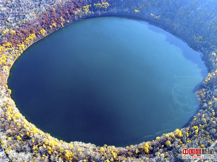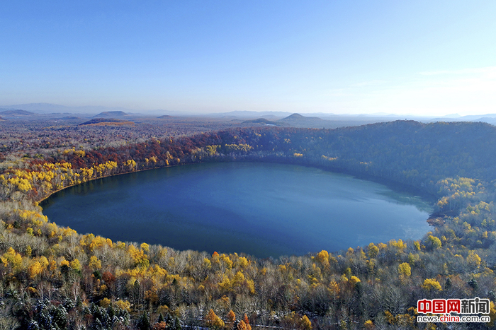 2017年10月12日,航拍吉林龙湾群国家森林公园内的龙湾火山口。龙湾国家森林公园位于吉林省辉南县东南部,属长白山系龙岗山脉。龙湾,是古地质年代由火山喷发而形成的高山湖泊。俯瞰火山口全景,山如盘龙,湖如玉镜,枫叶如火。宋利 摄