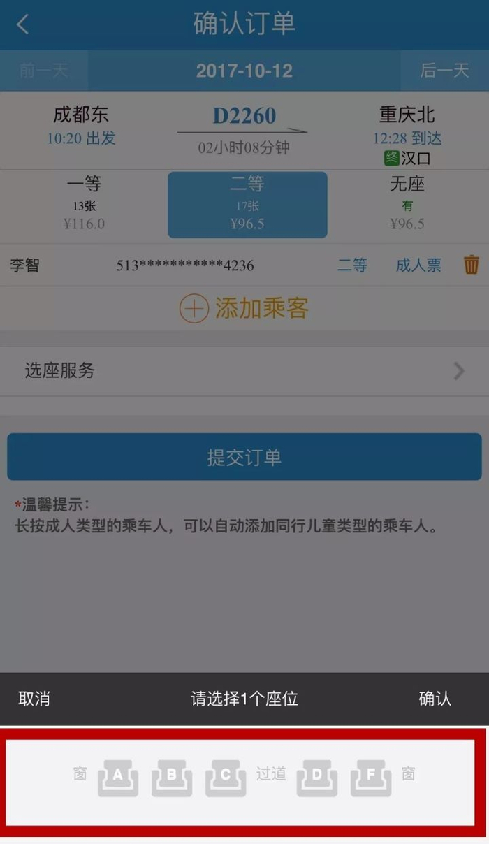 ②此功能仅为您提供相邻座位关系选择,如果剩余车票不能满足需求,系统将为您自动分配席位。
