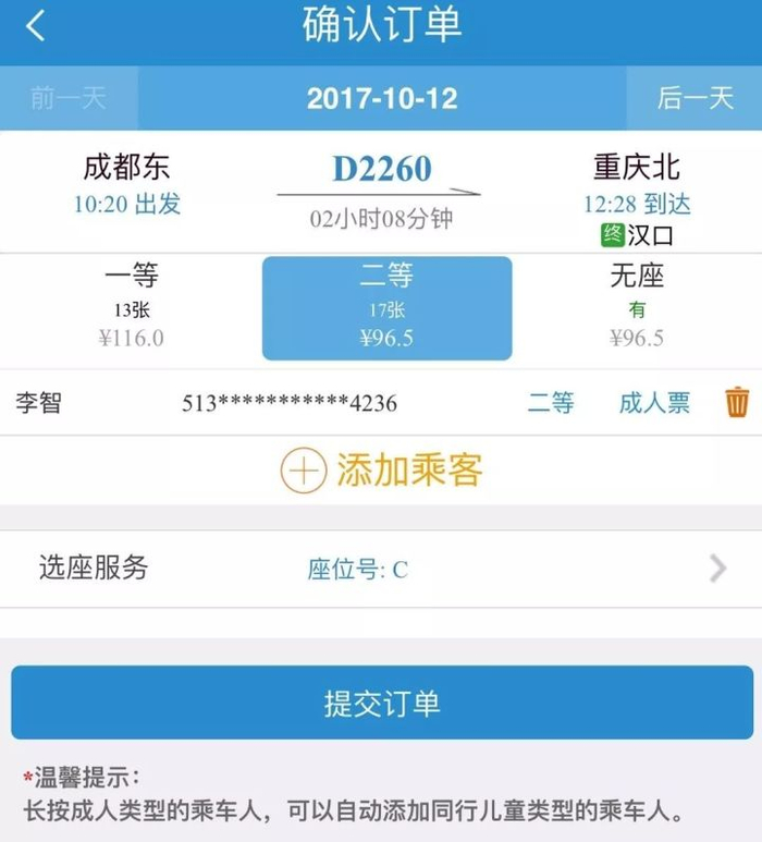 选定合适的车次后,点击“预订”系统将再次进行提示,选择对应车次所需席别及对应乘车人等信息后提交订单,后续按系统提示完成支付即可。