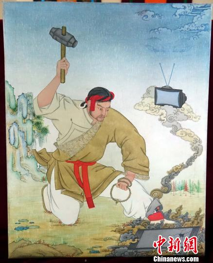 学员索朗曲桑将关注点聚焦于手机等电子产品,尝试用作品《世界的眼》呼吁人们关注电子产品之外的美好事物。 孙翔 摄