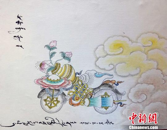 学员嘎松次仁以藏族绘画里常见的吉祥八宝图案为基础,在造型上进行创新,将其组合为摩托车的图案。 孙翔 摄
