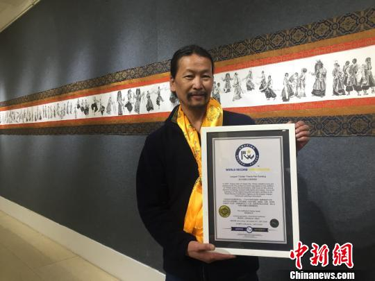 画家黄家林手捧《最长的藏戏主题钢笔画》认证证书,背后是他的作品 赵玉芹 摄
